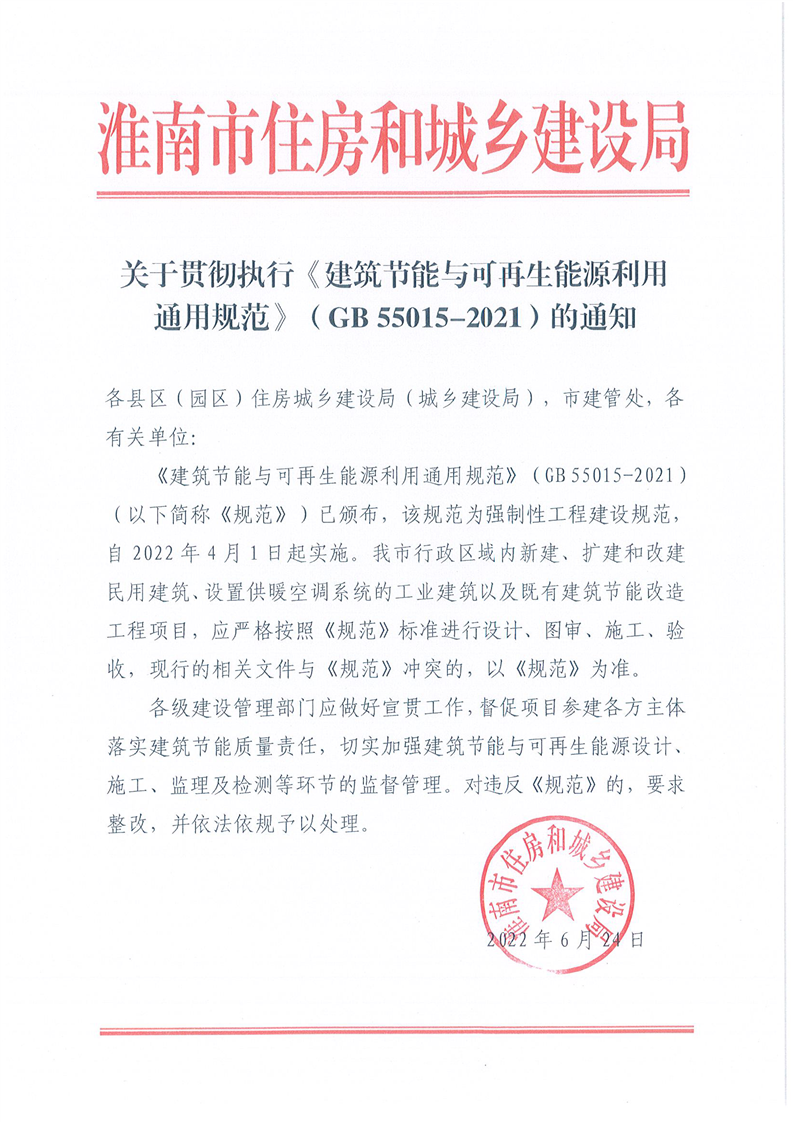 淮南市关于贯彻执行《建筑节能与可再生能源利用通用规范》(GB55015-2021)的通知